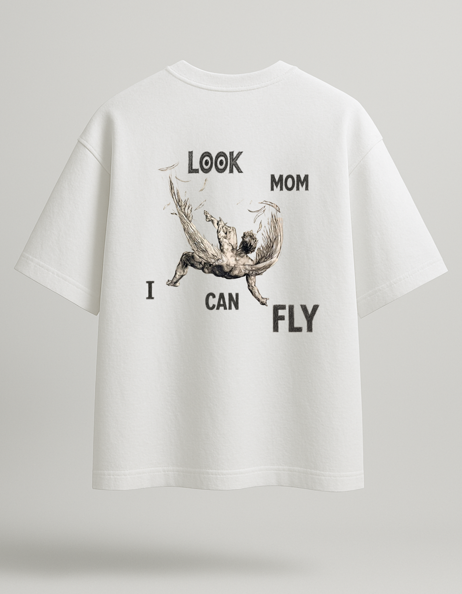 The Mom I can fly Tee is a bold expression of rebellion, ambition, and the human spirit. Crafted in an oversized silhouette, it delivers both comfort and edge. The front carries a raw sketch-style face graphic, while the back explodes with a powerful scene — the words “Look Mom, I Can Fly” framing a fallen figure with broken wings, symbolizing both rise and fall, risk and reward.